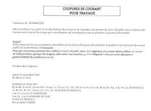 View Larger Image Coupure électrique le 19 novembre Afin d’améliorer la distribution électrique, la société ENEDIS a programmé des travaux qui entraîneront une coupure d’électricité sur le territoire de Bousbecque le 19 novembre entre 8h15 et 12h00. Par Nicolas Machu|2019-10-30T11:48:40+01:00octobre 23rd, 2019|Cadre de Vie, Urbanisme / travaux|0 commentaire