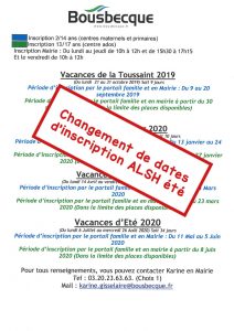 View Larger Image Inscriptions ALSH été 2020 : changement de date Les inscriptions aux accueils de loisirs de cet été sont décalées au jeudi 28 mai prochain. Plus d’informations à venir sur les modalités d’organisation. Par Nicolas Machu|2020-04-30T13:26:48+02:00avril 30th, 2020|Jeunesse|0 commentaire