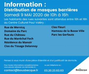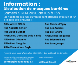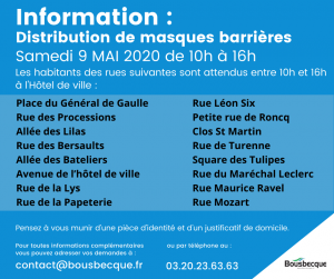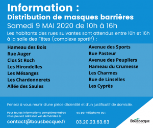 Le samedi 9 mais prochain de 10h à 16h, la municipalité organise une distribution de masques à la population.