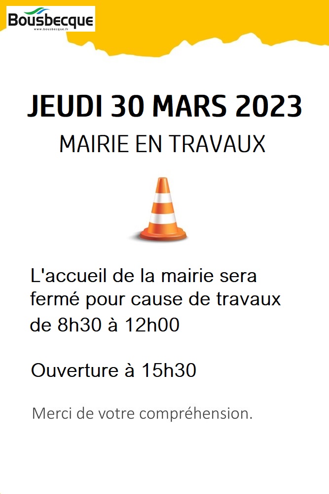 MAIRIE EN TRAVAUX - l'accueil sera fermé le jeudi 30 mars 2023 de 8h30 à 12h.