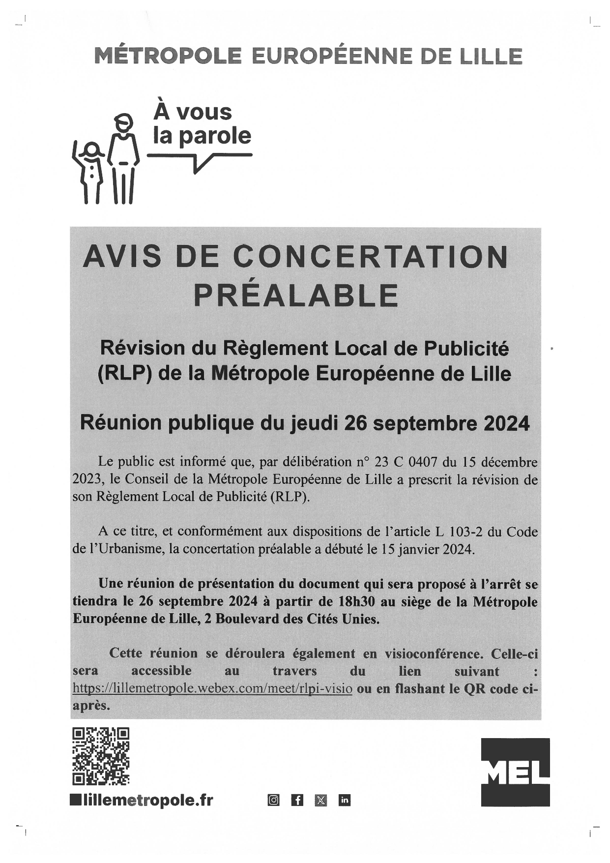 Avis de Concertation préalable – révision du Règlement Local de Publicité de la MEL