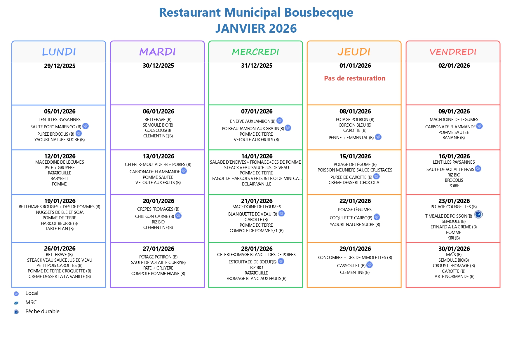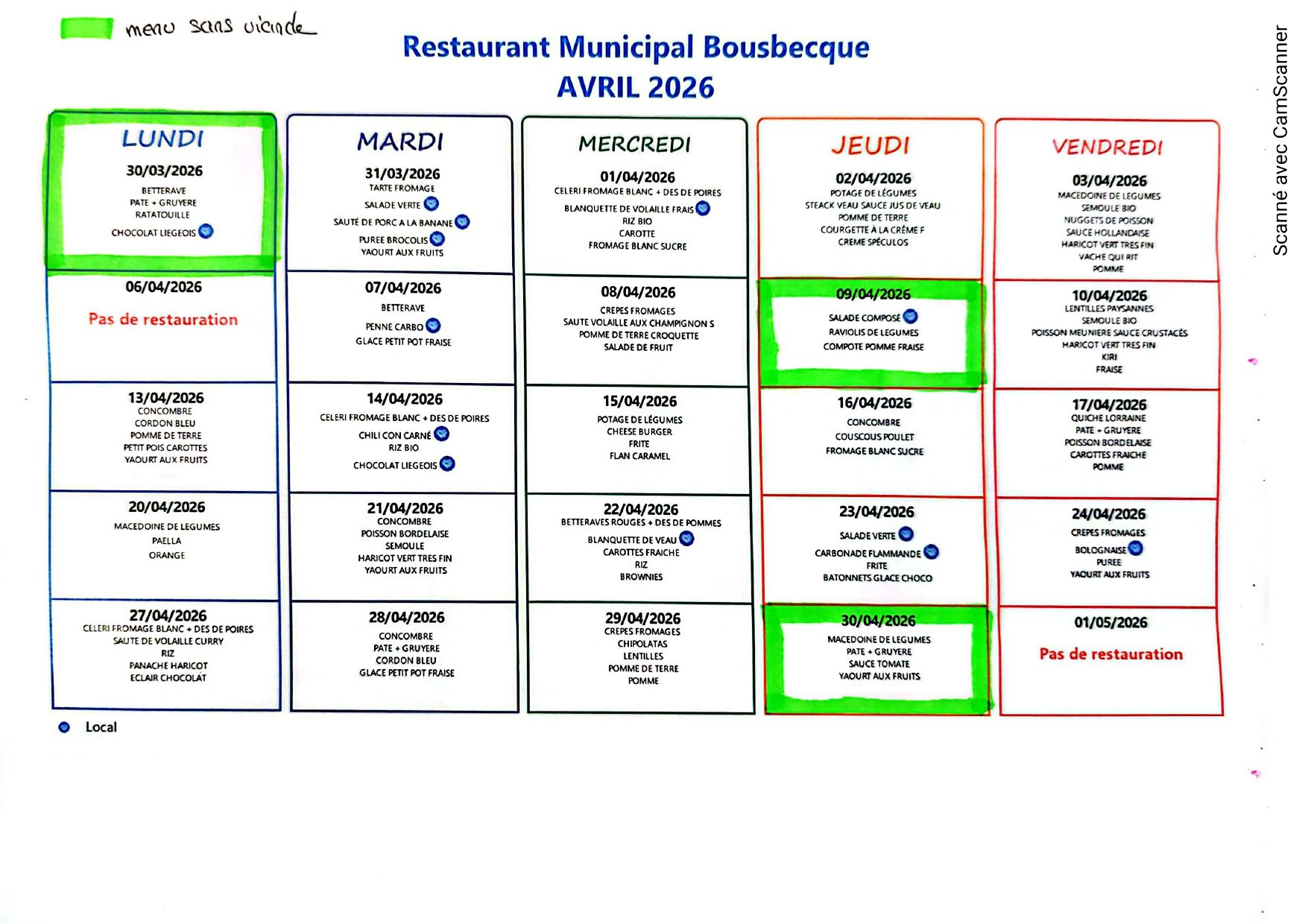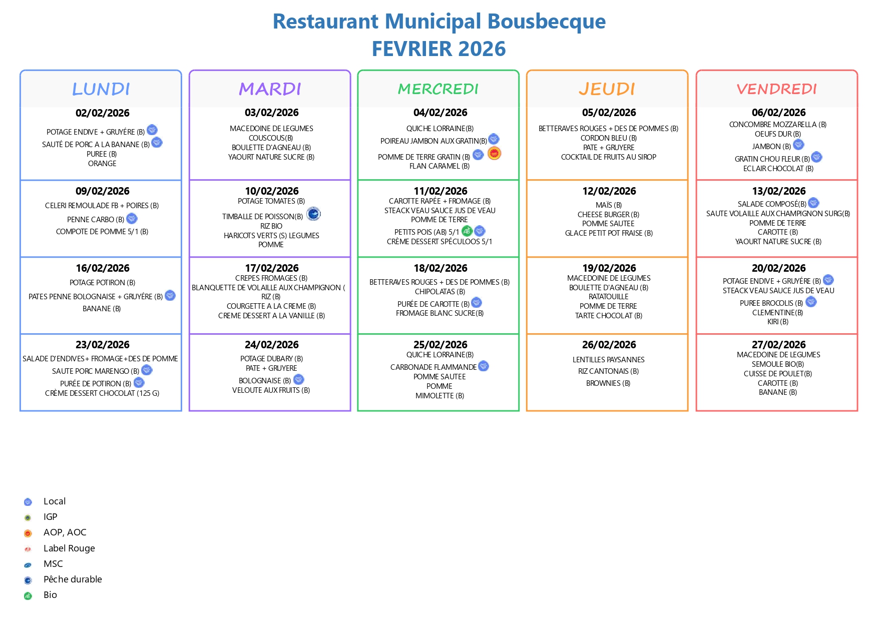 La commission des menus se réunit environ toutes les six semaines dans le but d’établir les menus de vos enfants. Cette commission est composée de l’élu, du responsable du service scolaire, des responsables des cuisines, des directeurs d’écoles ainsi que des parents délégués. Elle permet de s’assurer de l’équilibre diététique des repas de la période précédente et à venir, d’analyser et de tirer des conclusions concernant la consommation de certain aliment, de proposer de nouveaux plats……..